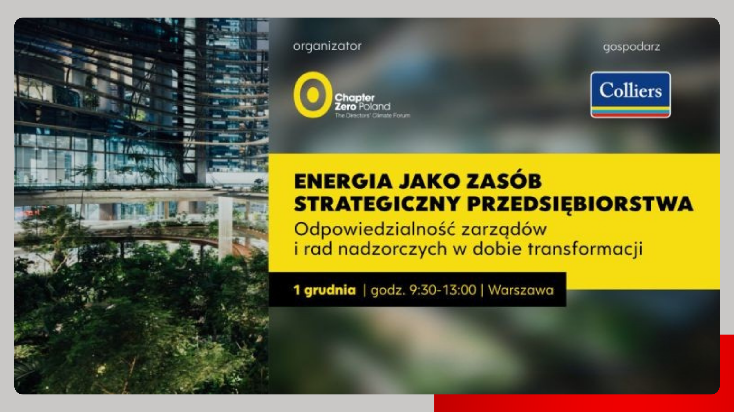 Dziękujemy organizatorom Chapter Zero Poland oraz Colliers Poland za zaproszenie oraz inspirującą przestrzeń do wymiany doświadczeń na temat zrównoważonego rozwoju i transformacji energetycznej.